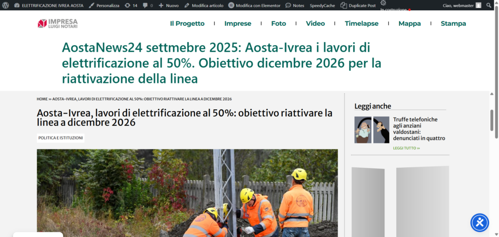 AostaNews24 settmebre 2025: Aosta-Ivrea i lavori di elettrificazione al 50%. Obiettivo dicembre 2026 per la riattivazione della linea