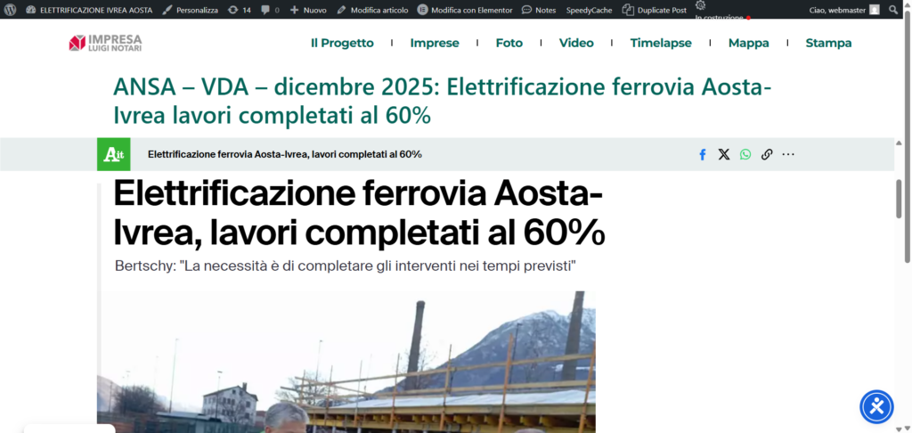 ANSA – VDA – dicembre 2025: Elettrificazione ferrovia Aosta-Ivrea lavori completati al 60%